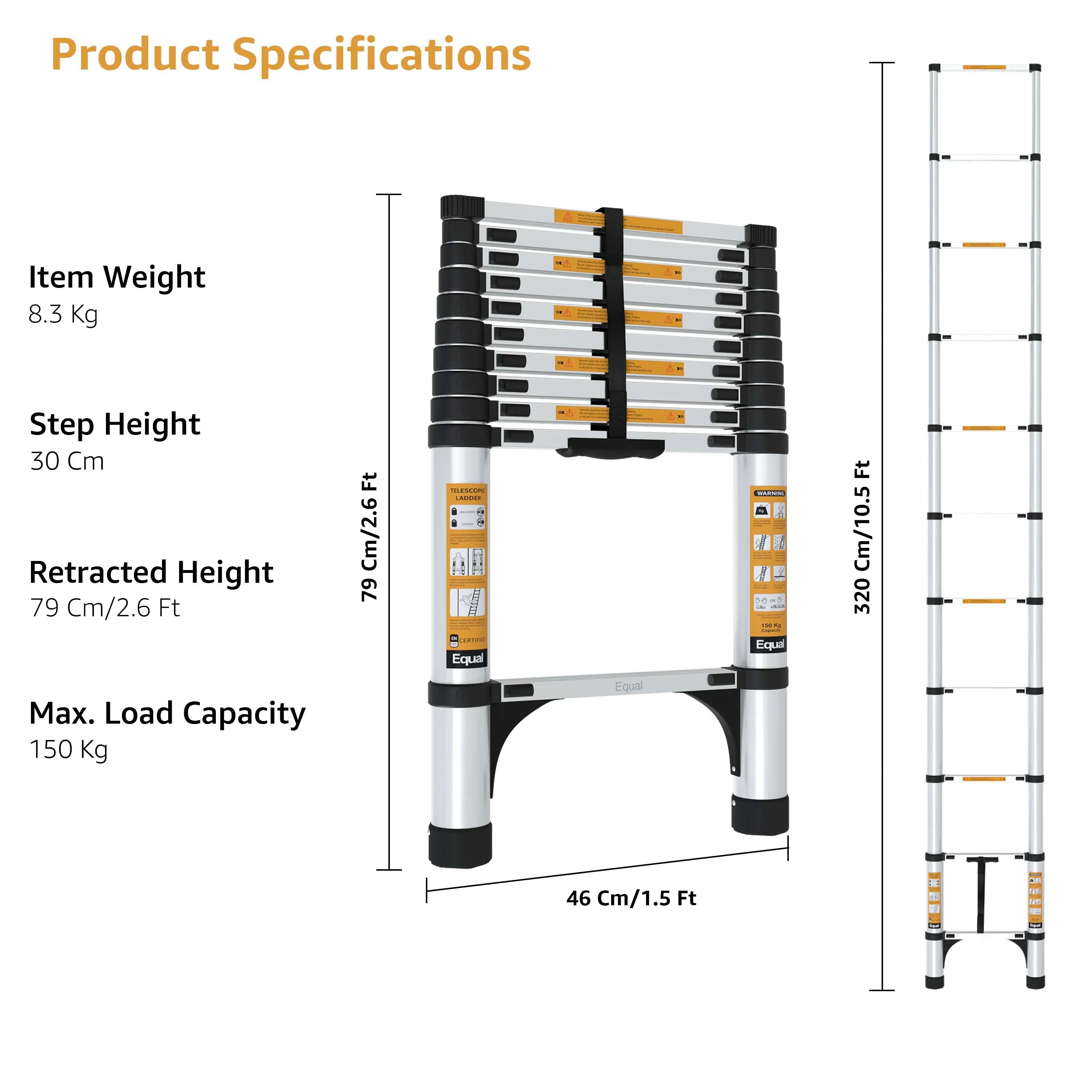 Equal 10.5 FT Aluminum Folding Telescopic Ladder with 2 Triangle Stabilizers | EN131 Certified with 2 Year Warranty | 150kg Max Capacity | Collapsible Ladder for Home or Outdoor Work (3.2m/11 Step)