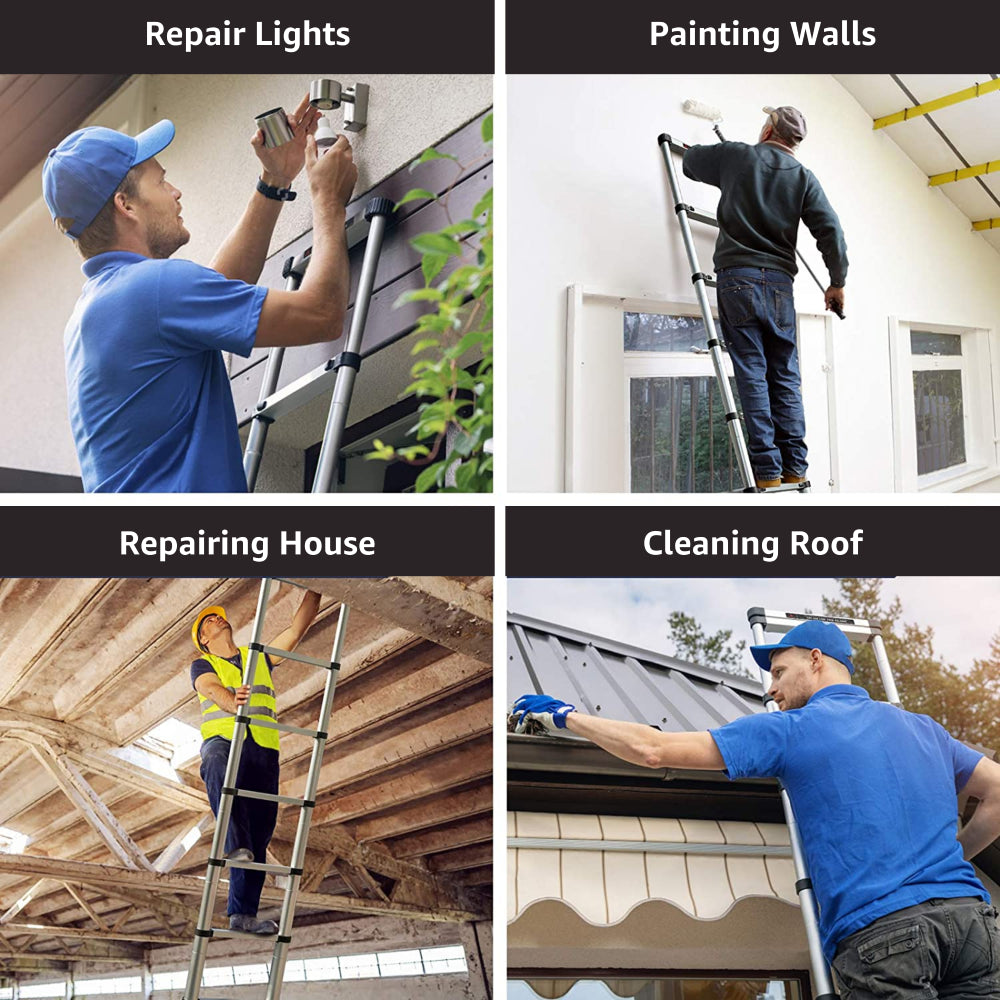 • Easy to Use: No complicated setup or assembly required. Simply unlock the ladder's locking mechanism, extend it to your desired height, and lock it in place for stability.