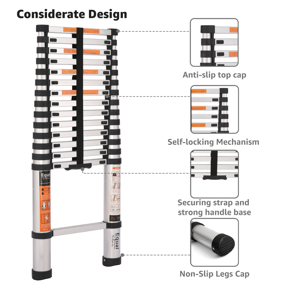 • Safety First: Your safety is our priority. This telescopic ladder EN131 Certified. Additionally, each step is equipped with a secure locking mechanism to ensure stability and minimize wobbling.