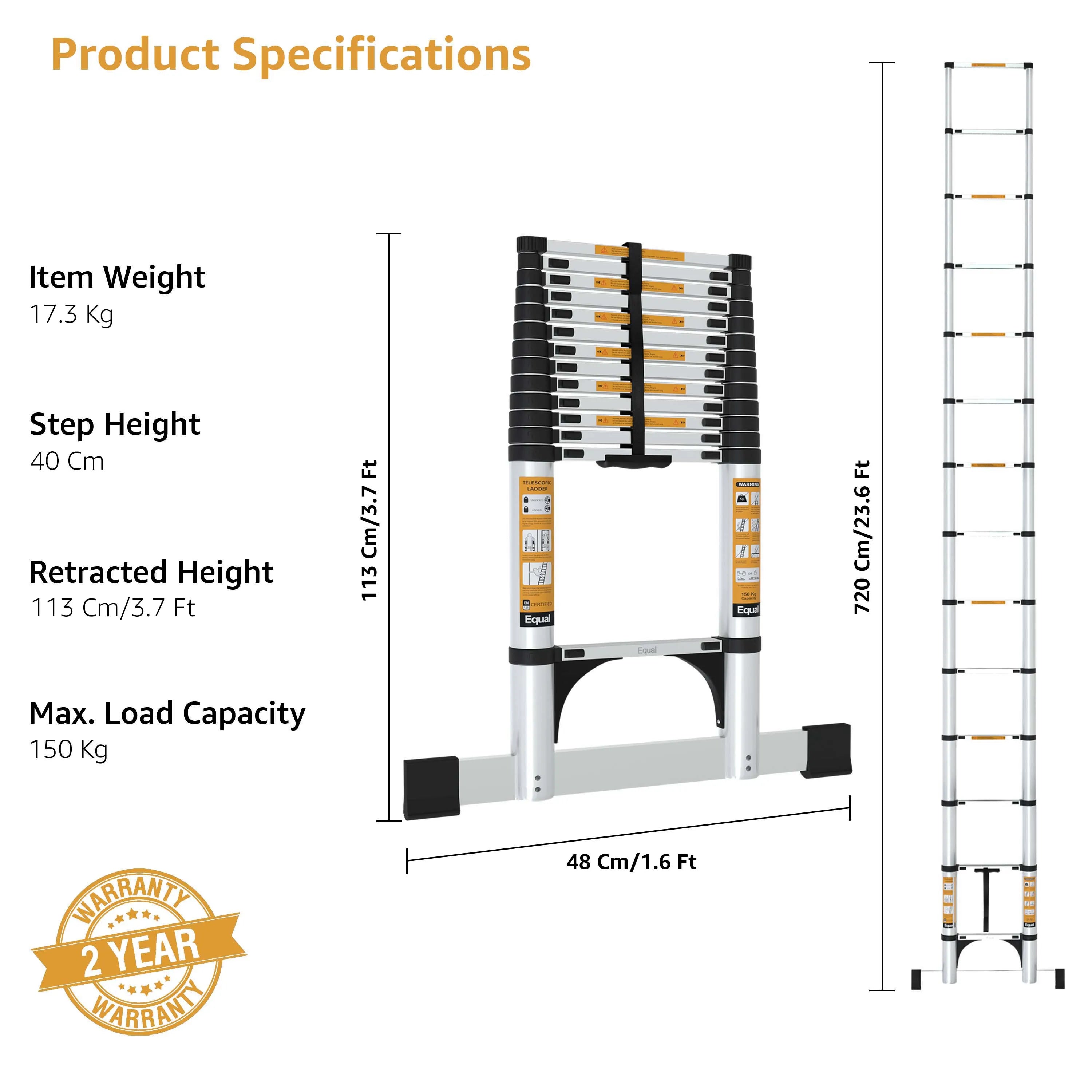 Equal 23.6 FT Aluminum Folding Telescopic Ladder with 2 Triangle Support & Stabilizers | EN131 Certified with 2 Year Warranty | 150kg Max Capacity | Ladder for Home or Outdoor Work (7.2m/16 Step)