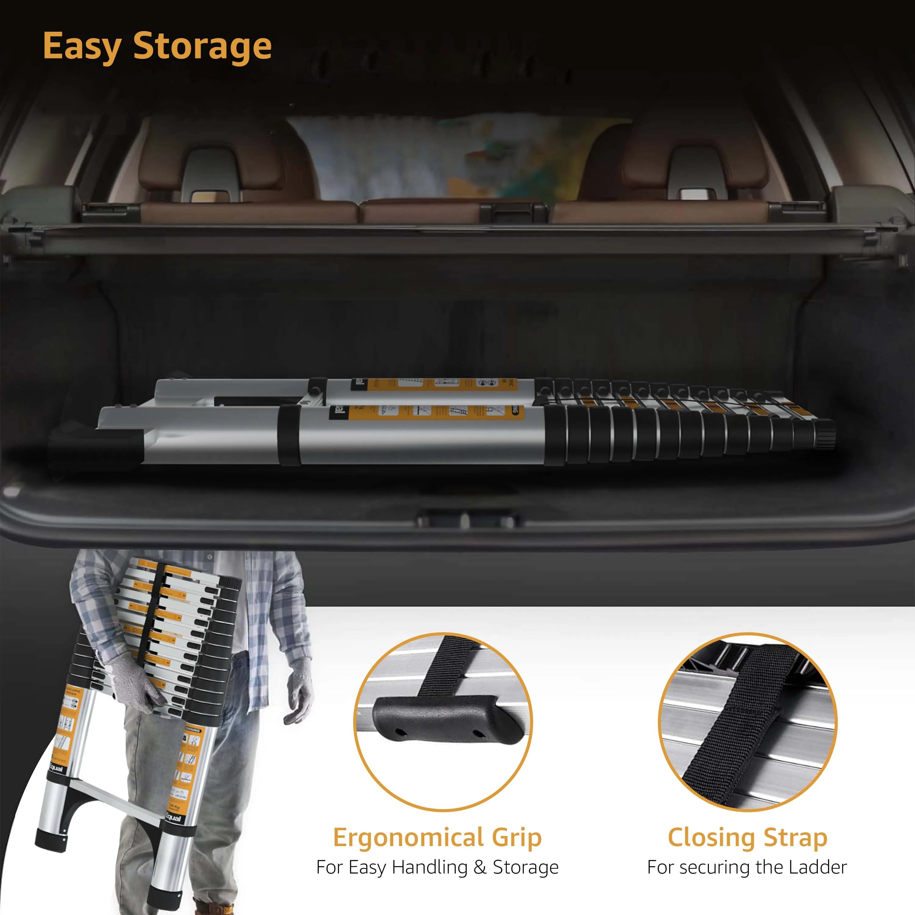 • User-Friendly Operation: The ladder extends and retracts smoothly with an innovative retraction system, ensuring effortless setup and takedown. Our telescopic ladder collapses down to a fraction of its full height, making it incredibly easy to store in small spaces like closets, car trunks, or garages.