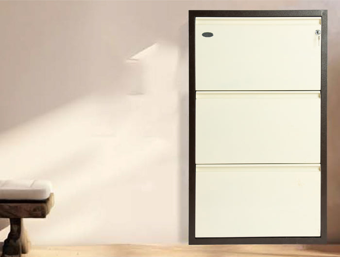 The stylish and practical Equal shoe storage rack is a 3-tier unit that can store up to 9-11 pairs of shoes. A great storage solution for keeping your hallway neat and tidy and free of shoe clutter. simple and elegant, the unit finished in white color will complement any hallway interior and with it's tall and slim design, makes great use of valuable space -Ideal for hallways, entryway, office and home. Material: This space-saving 3 door shoe storage cabinet is made of powder coated 0.8mm heavy duty mild steel which is rustproof. Color: Powder-Coated White and Brown color: a hard finish that is tougher than conventional paint. Size; 65.5W x 15L x 98H Cm. Item-weight; 17.20kg. Storage: Holds 9 to 12 pair of shoes, slipper or boots. Safety Lock: The shoe stand is equipped with safety lock to keep your footwear safe even outside flat/home or office without worrying about safety. It has 4 pre-drilled holes for mounting on the wall. Ventilation Hole: This shoe rack comes with ventilised holes to keep your shoes odorless. Perfect for every Shoe: The large shelves work perfectly for boots, high heels, shoes and slippers and the door design allows you to find shoes quickly. Assembly Instruction: This shoe rack is ready to use. Easy installation at any wall or you can even use it as free standing. For assembly instructions; call our customer service support. 3 Year limited warranty.