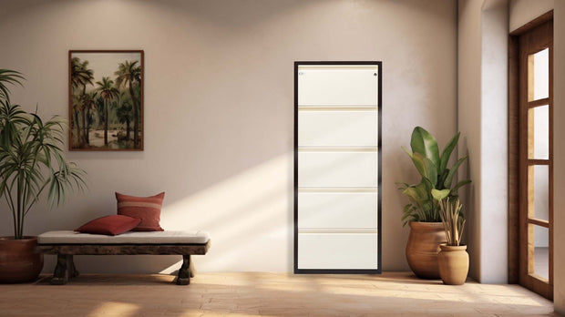 The stylish and practical Equal shoe storage rack is a 5-tier unit that can store up to 15-18 pairs of shoes. A great storage solution for keeping your hallway neat and tidy and free of shoe clutter. simple and elegant, the unit finished in white color will complement any hallway interior and with it's tall and slim design, makes great use of valuable space -Ideal for hallways, entryway, office and home. Material: This space-saving 5 door shoe storage cabinet is made of powder coated 0.8mm heavy duty mild steel which is rustproof. Color: Powder-Coated White and Brown color: a hard finish that is tougher than conventional paint. Size: 65.5W x 15L x 159H Cm., Item-weight; 28.50kg. Storage: Holds 15 to 18 pair of shoes, slipper or boots. Safety Lock: The shoe stand is equipped with safety lock to keep your footwear safe even outside flat/home or office without worrying about safety. It has 4 pre-drilled holes for mounting on the wall. Ventilation Hole: This shoe rack comes with ventilised holes to keep your shoes odorless. Perfect for every Shoe: The large shelves work perfectly for boots, high heels, shoes and slippers and the door design allows you to find shoes quickly. Assembly Instruction: This shoe rack is ready to use. Easy installation at any wall or you can even use it as free standing. For assembly instructions; call our customer service support 3 Year limited warranty.