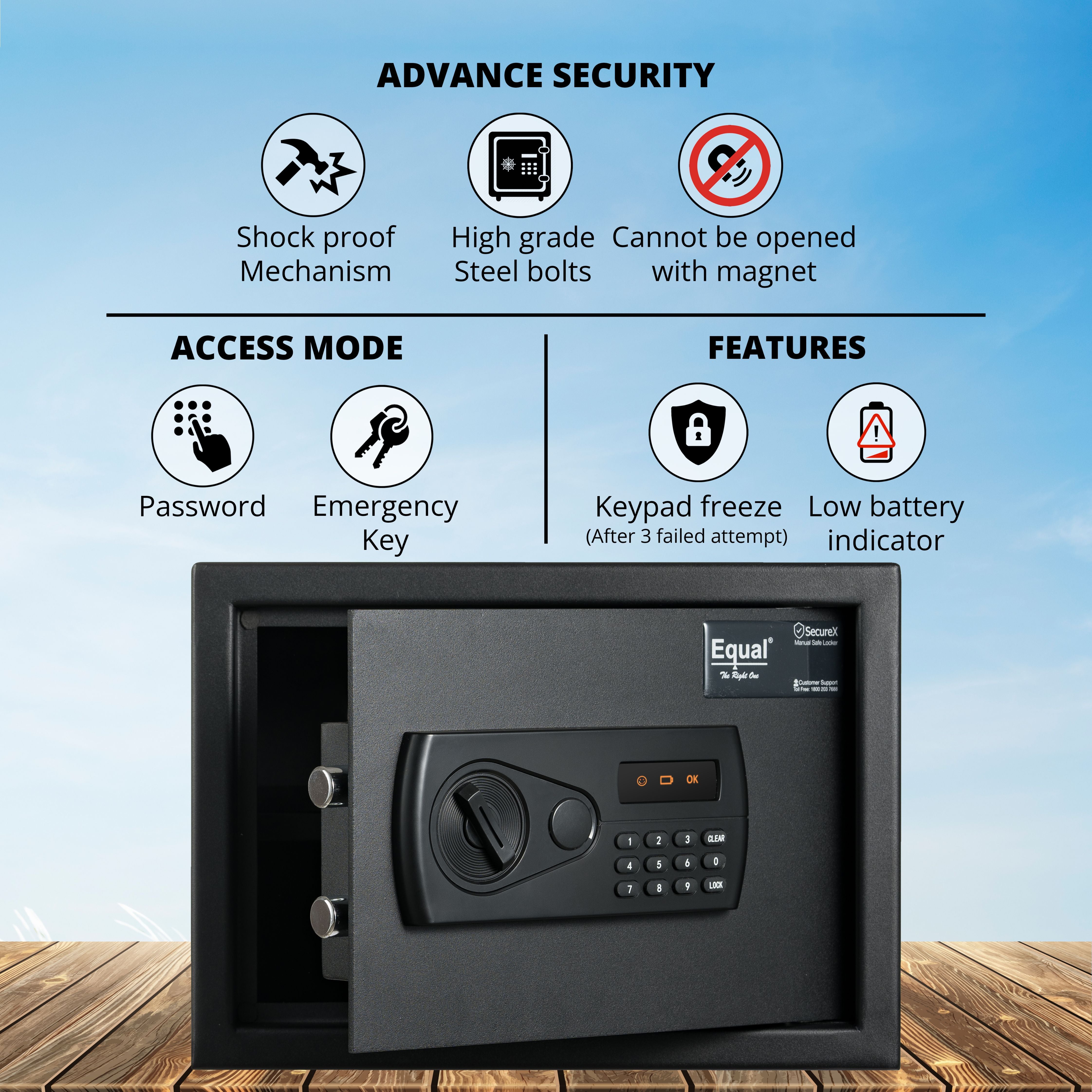 Equal 20L SecureX Digital Safe Locker with Pincode Access and Emergency Key - Black