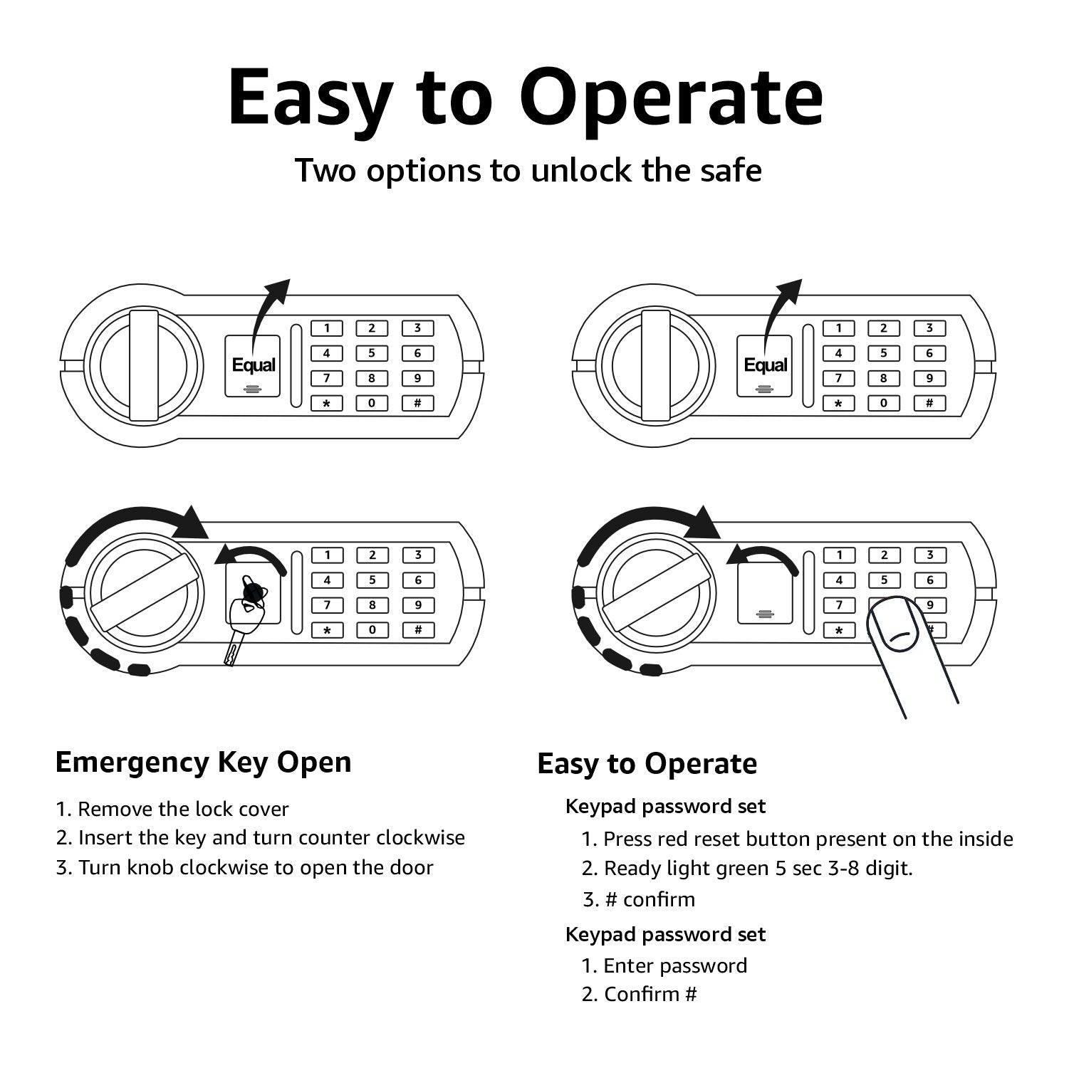 • Opens with digital pin code or override keys. Pincode can be programmed 3 to 8 digits long.